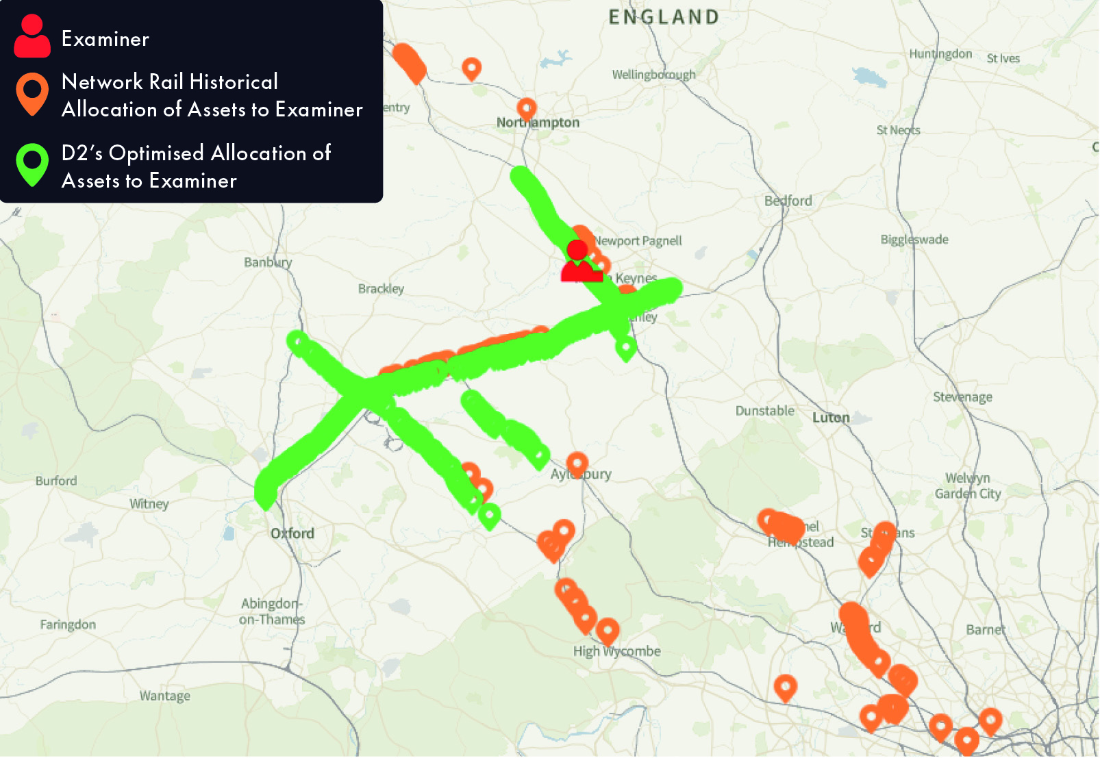 Network Rail’s NW&C structural examination team is responsible for inspecting thousands of railway assets such as bridges, retaining walls, and other structures across a region stretching from Cumbria to London. Historically, examiner-to-asset allocation relied on regional teams’ localised knowledge and planning, rather than data-driven planning, resulting in examiners routinely travelling long distances to assets that could have been inspected by closer examiners. In CP7 Year 1 (FY 2024/25) examiners were spending a disproportionate share of their working day behind the wheel rather than conducting inspections, causing high driving costs and low levels of productivity. Under mounting CP7 budget pressures and growing regulatory compliance demands, Network Rail needed a step-change in how examination portfolios were planned and resourced.